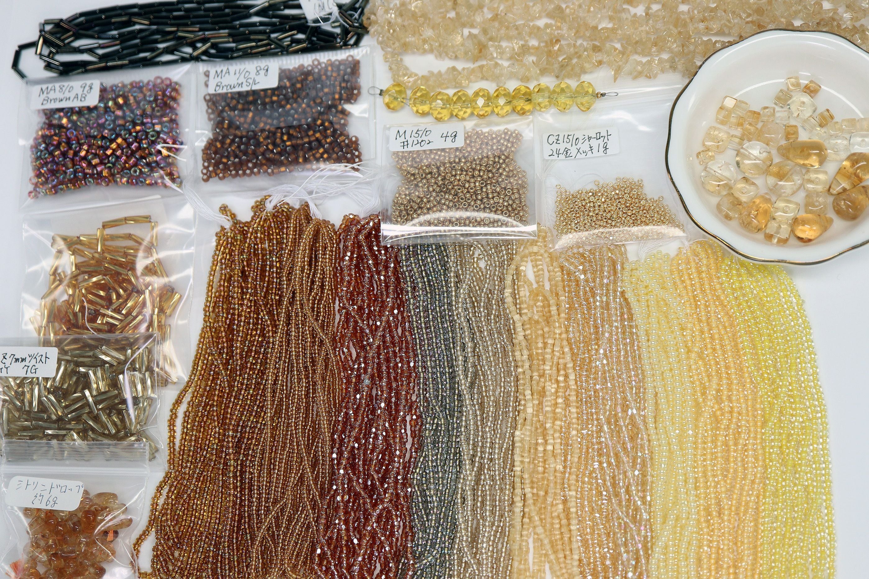 ■ 色:多彩な茶系、イエロー、ゴールドのビーズが含まれています。様々なトーンの色調が楽しめます。1mずつのビーズも色見本として重宝します。関東以外は大阪でも実店舗が少なくなり、実際のビーズの色を確認するのが難しくなっています。新作創りにインターネットで必要な色を注文しても、ネット上の色と実際の色が異なり困ることがあります。ロット違いで同じ色でない場合もあるとは言え。