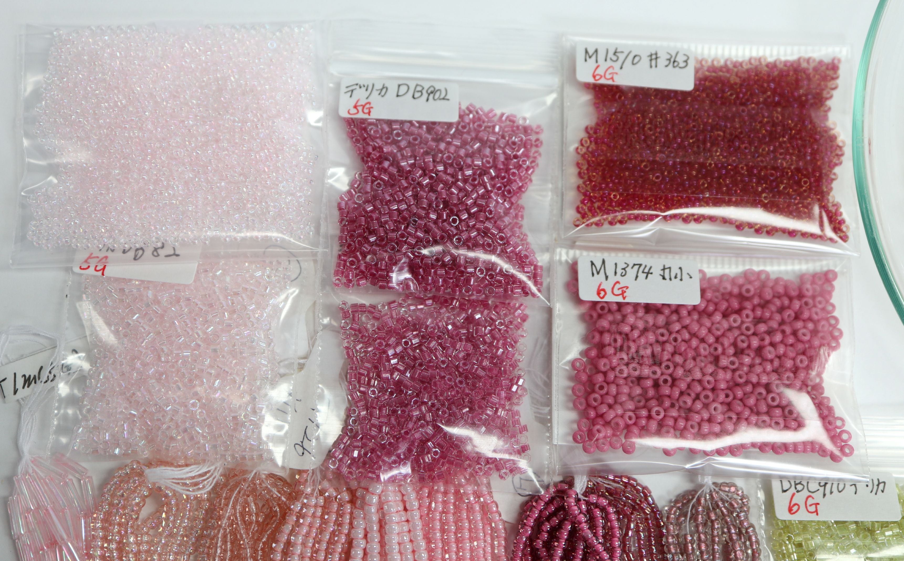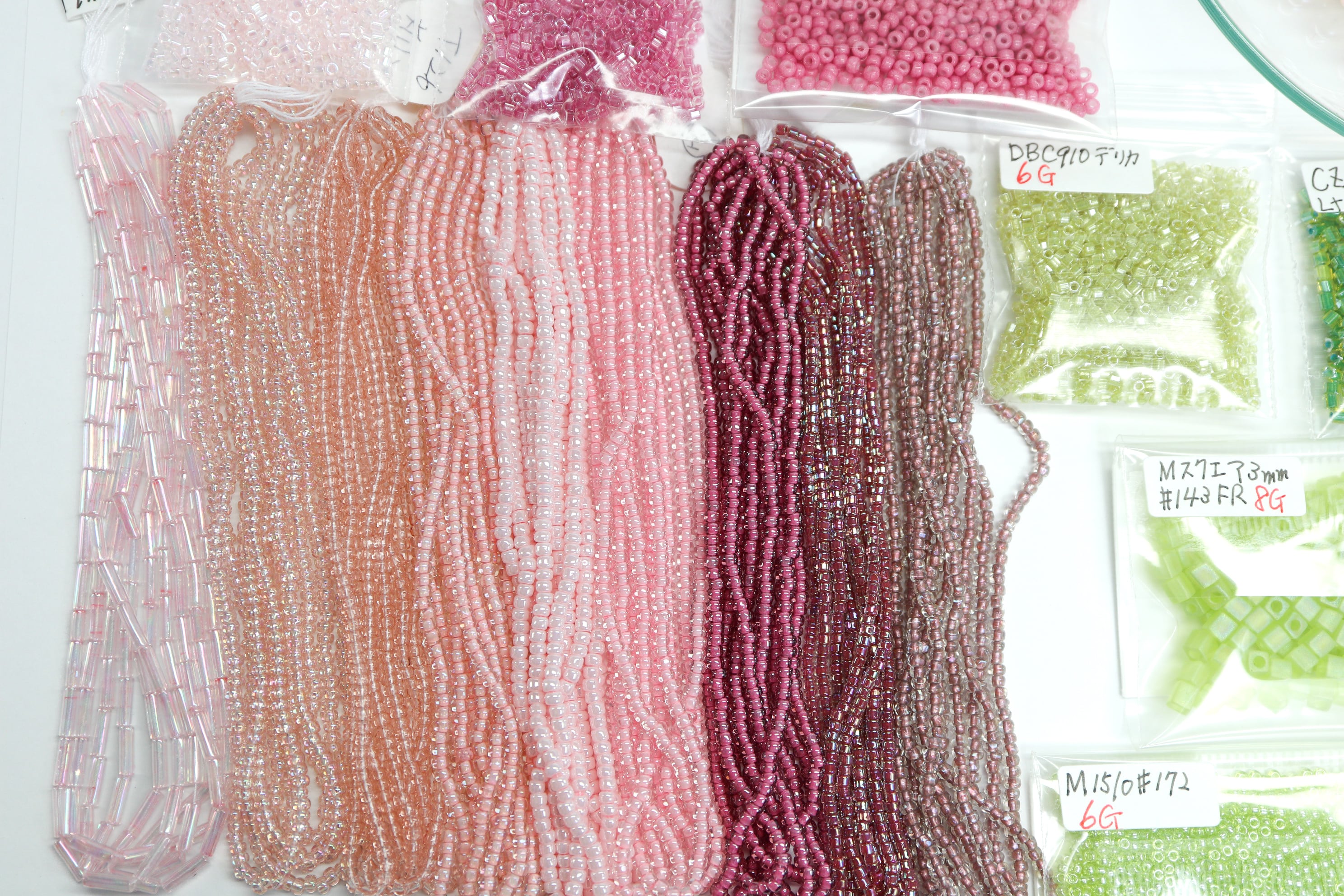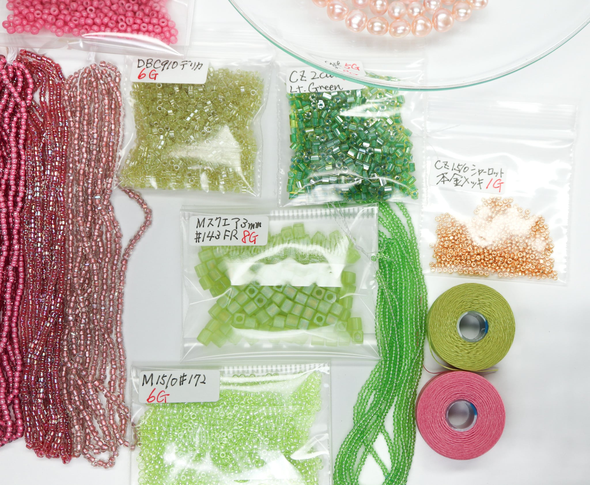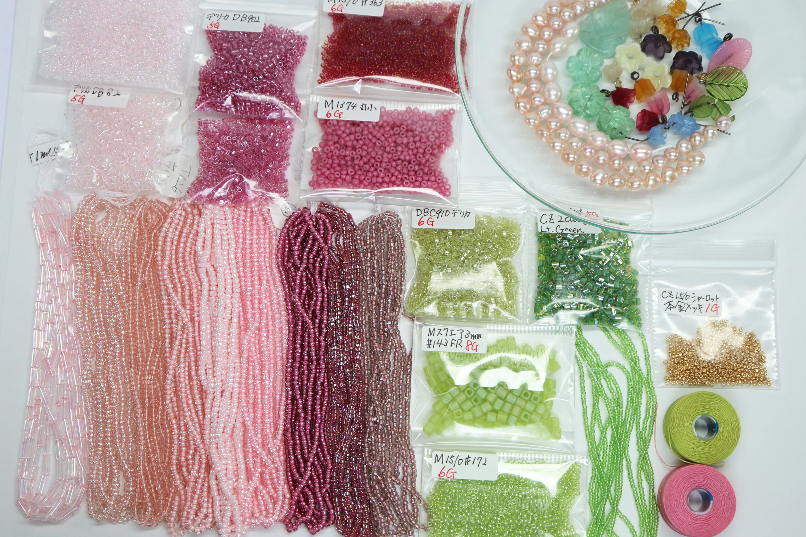 〈糸通しビーズ、画像左から〉